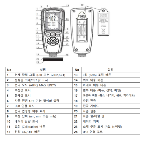측정기는 샘플의 종류, 크기, 형태에 따라 함께 제공되는 철판 또는 비철판과는 별도의 측정 원샘플 (코팅이 되어 있지 않은 동일한 크기와 직경의 원소재) 에서 0점 및 사용자 교정을 해야 정확한 측정을 가능 측정기의 0점 조정 방식은 아래와 같습니다.